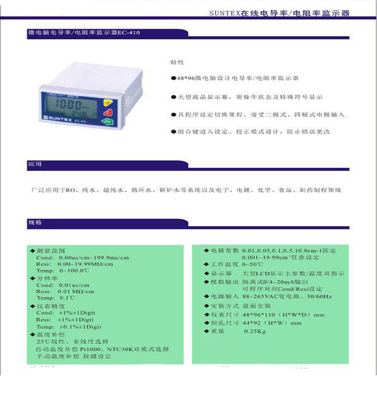 型號:SUNTEX電導率儀EC-410水質監測電導率控制儀電阻率變送器