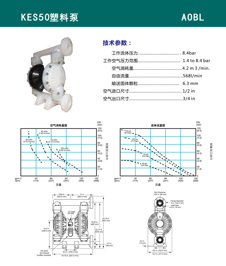 AOBL氣動泵KES50系列工程塑料金屬泵材質膜片可選耐磨 氣動隔膜泵