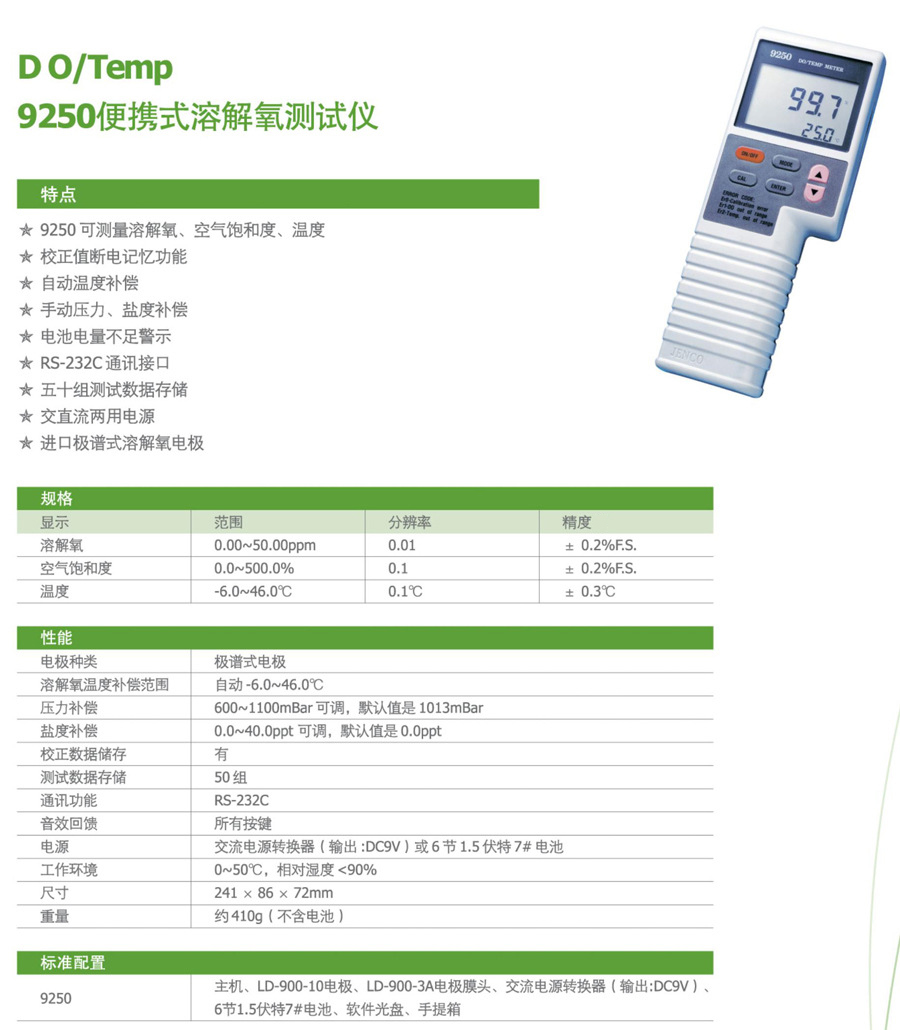 參數(shù):0~50ppm,0~500%,-6~46.0℃,鹽度補(bǔ)償范圍0~40.0ppt,壓力補(bǔ)償范圍600~1100mBar,50組數(shù)據(jù)存儲(chǔ),RS-232C(極譜式)