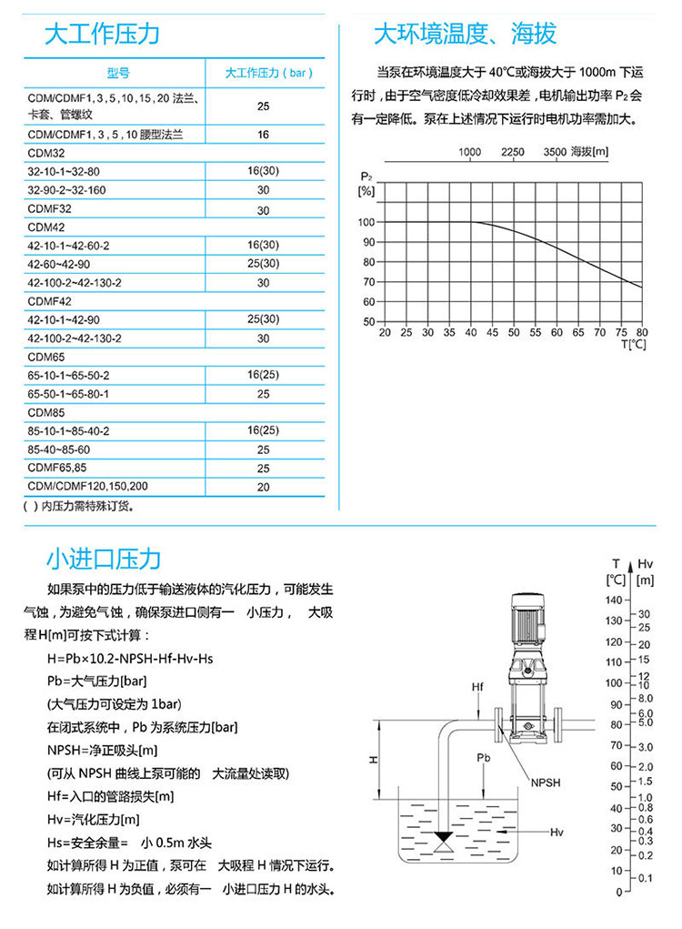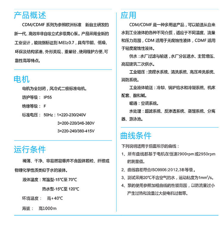 南方CDM/CDMF系列為參照歐洲標準新自主研發的新一代、高效率非自吸立式多級離心泵。產品采用全新的工業設計,能效指標達到MEI≥0.7,具有節能、低噪、環保及機構緊湊、外觀美觀、重量輕、使用維護方便、可靠性高等特點。