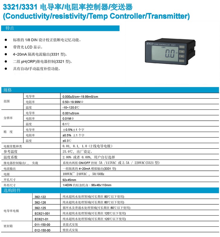 JENCO/任氏3321型在線電導率/電阻率/溫度變送器控制器(單機)