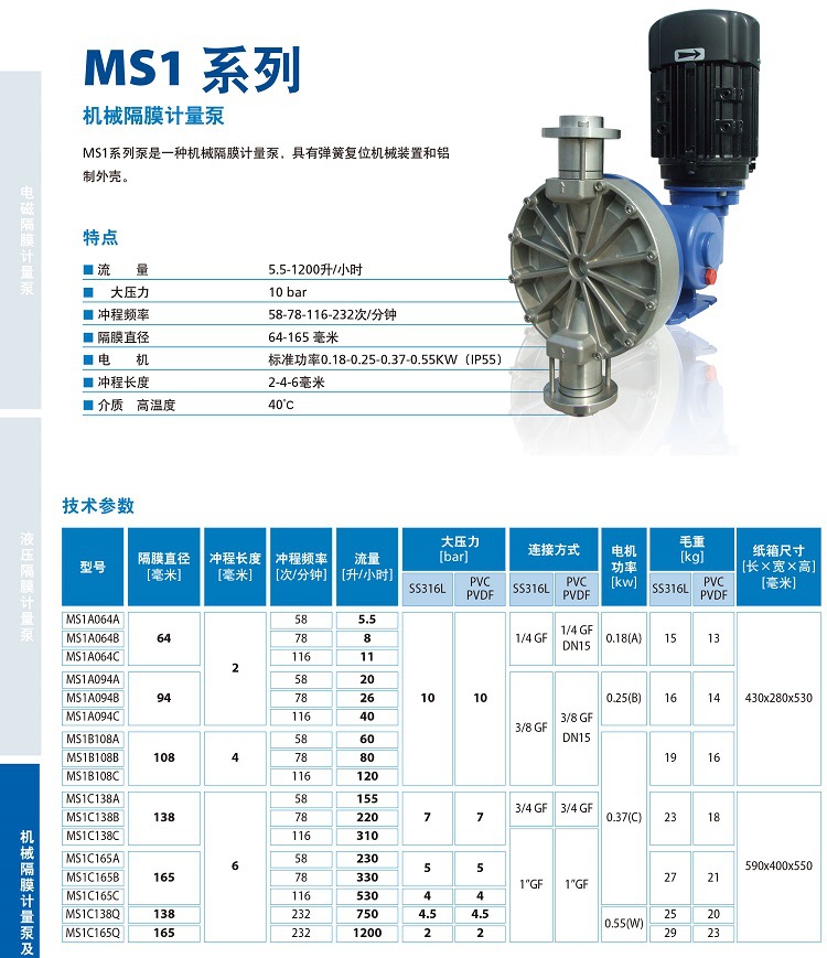 MS1系列泵是一種機械隔膜計量泵,具有彈簧復位機械裝置和鋁制外殼。