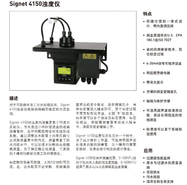 進口濁度儀4150還配有干燥劑更換提示、玻璃自動清洗功能,以便于維護。進口濁度儀4150有兩種量程可選。0 -100 NTU 型的用于低量程應用,如飲用水監測。0 - 000 NTU 型的可用于各種場合,如原水、廢水等。
