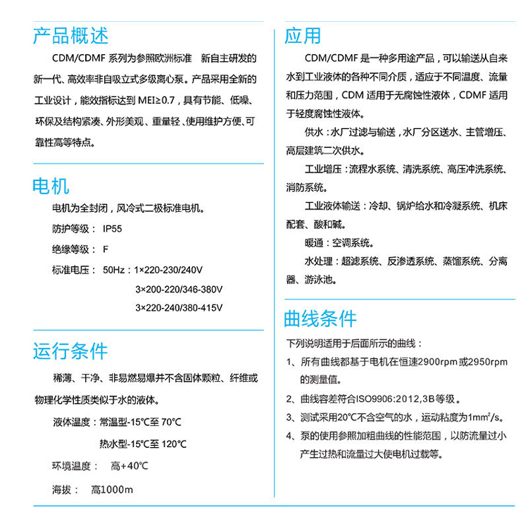 南方CDM/CDMF系列為參照歐洲標準新自主研發的新一代、高效率非自吸立式多級離心泵。產品采用全新的工業設計,能效指標達到MEI≥0.7,具有節能、低噪、環保及機構緊湊、外觀美觀、重量輕、使用維護方便、可靠性高等特點。