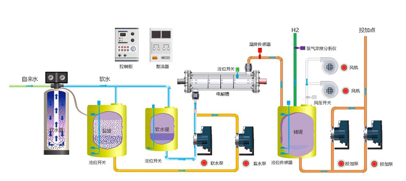 2、由軟化系統、軟水儲存系統、溶鹽系統、鹽水配比系統、供電及控制系統、電解系統、次氯酸鈉儲存系統、投加系統等系統組成;