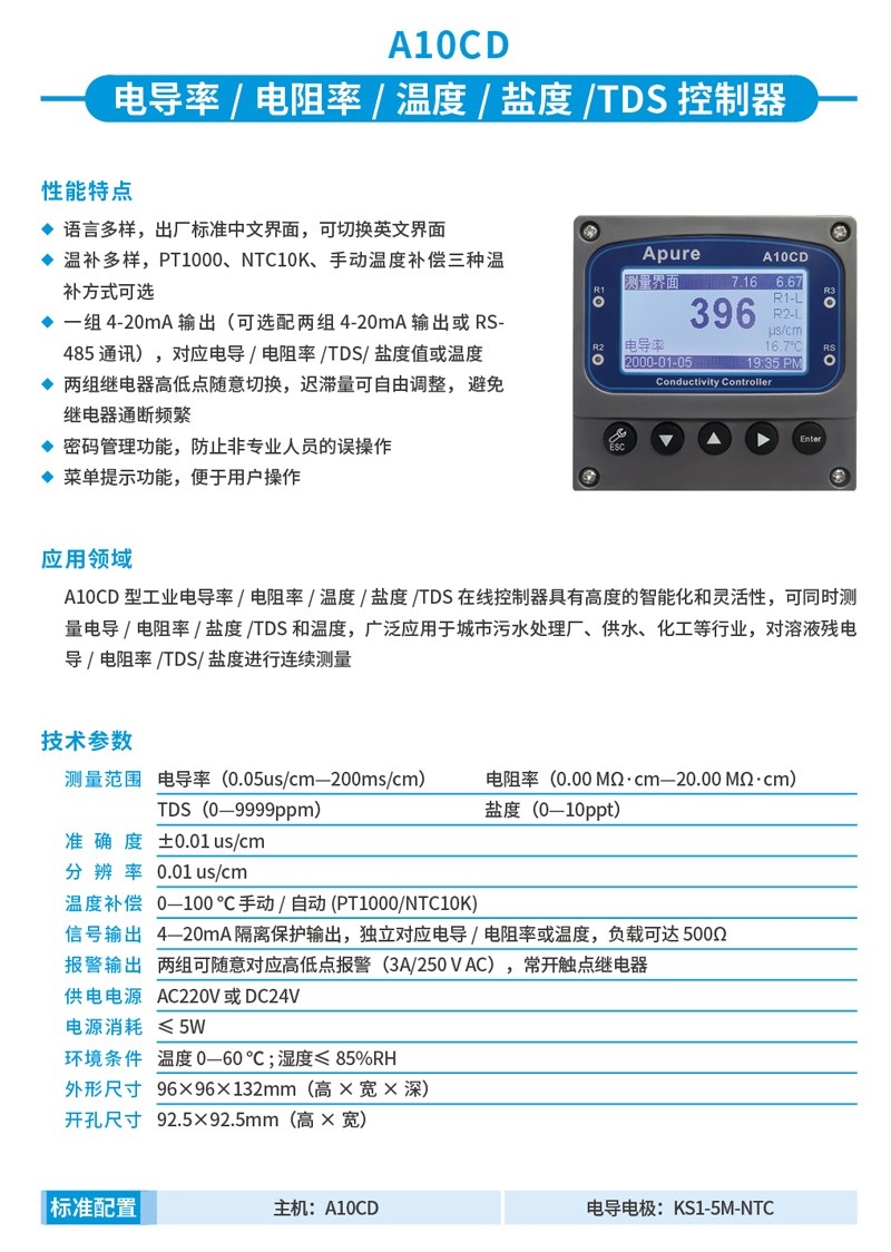 Apure電導儀A10CD-A-工業在線電導/電阻率控制器