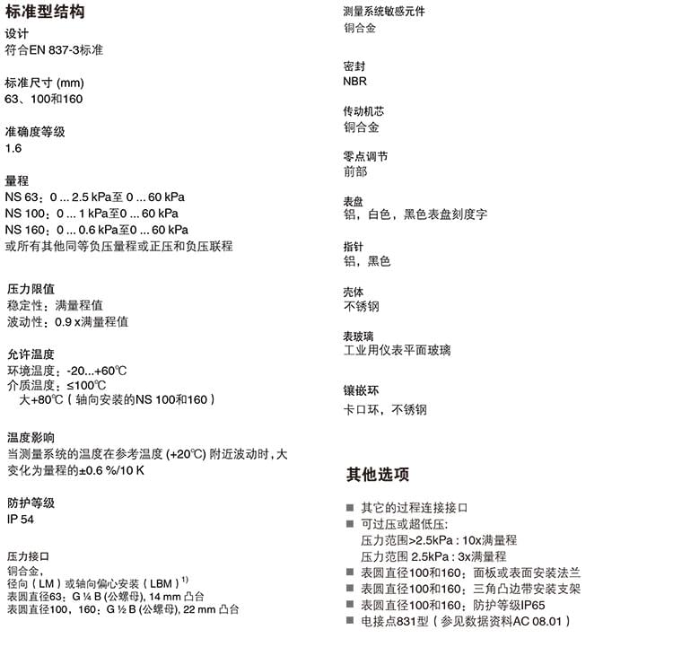 2. 膜片壓力表,化學工業型,表頭不充液/充液,高過壓保護壓力表,針對UHP應用:422.12 432.50 432.56 423.36 423.25