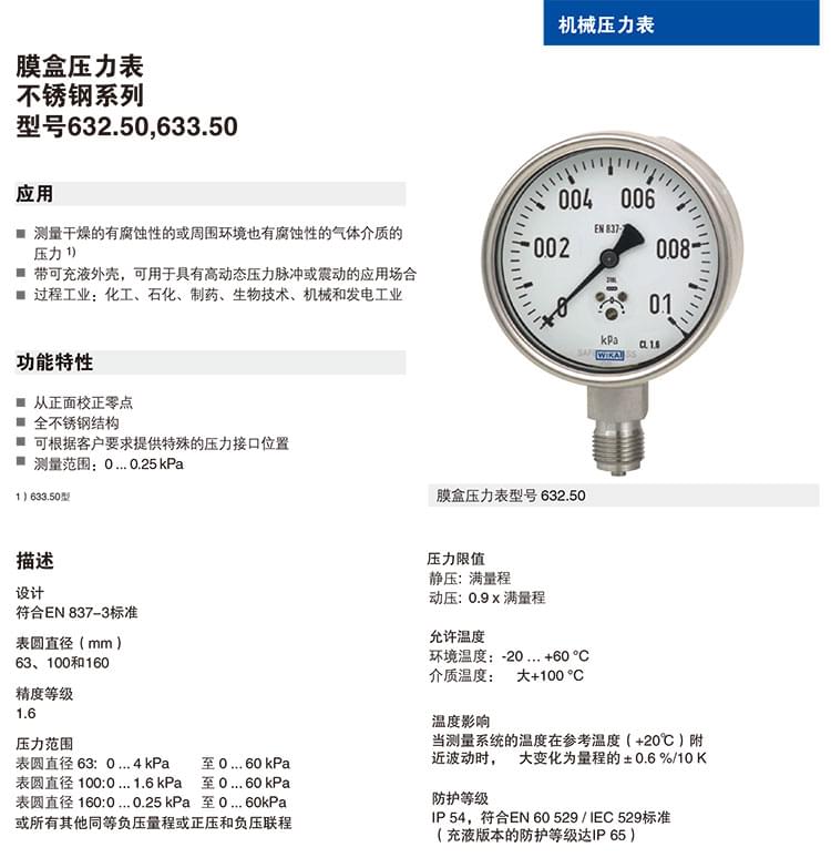不銹鋼膜盒壓力表632.50.63/632.50.100/632.50.160