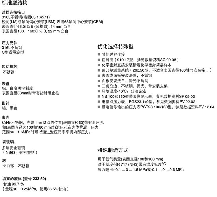 2. 膜片壓力表,化學工業型,表頭不充液/充液,高過壓保護壓力表,針對UHP應用:422.12 432.50 432.56 423.36 423.25