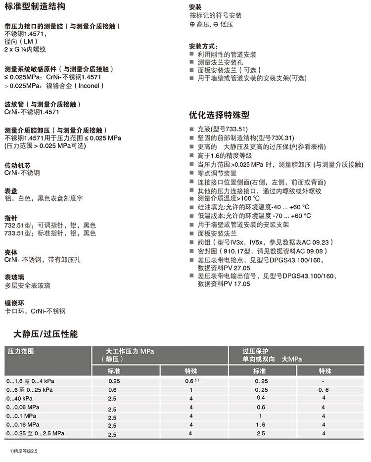 2. 膜片壓力表,化學工業型,表頭不充液/充液,高過壓保護壓力表,針對UHP應用:422.12 432.50 432.56 423.36 423.25