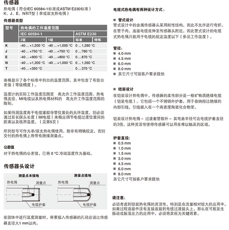 電纜式熱電偶溫度計特別適合需要直接將金屬傳探頭裝配到鉆孔(如在機械部件中)或測量過程的應用(即適用于所有不帶化學侵蝕性介質且無磨損的應用)。要將溫度計安裝到護套中,就需要使用一個彈性卡套接頭將探頭壓入護套底部。這樣可以確保施加在探頭的力度不超過臨界值。標準型電纜式熱電偶溫度計不帶過程連接件,不過可使用螺紋接頭、活動螺母等緊固件進行連接。