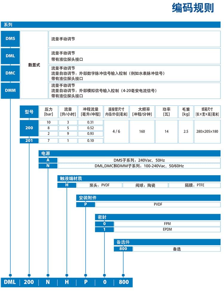電磁隔膜計量泵主要特征: 大壓力:10bar; 大流量:9升/小時;泵頭材質:PVDF
